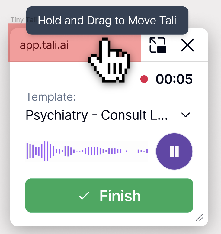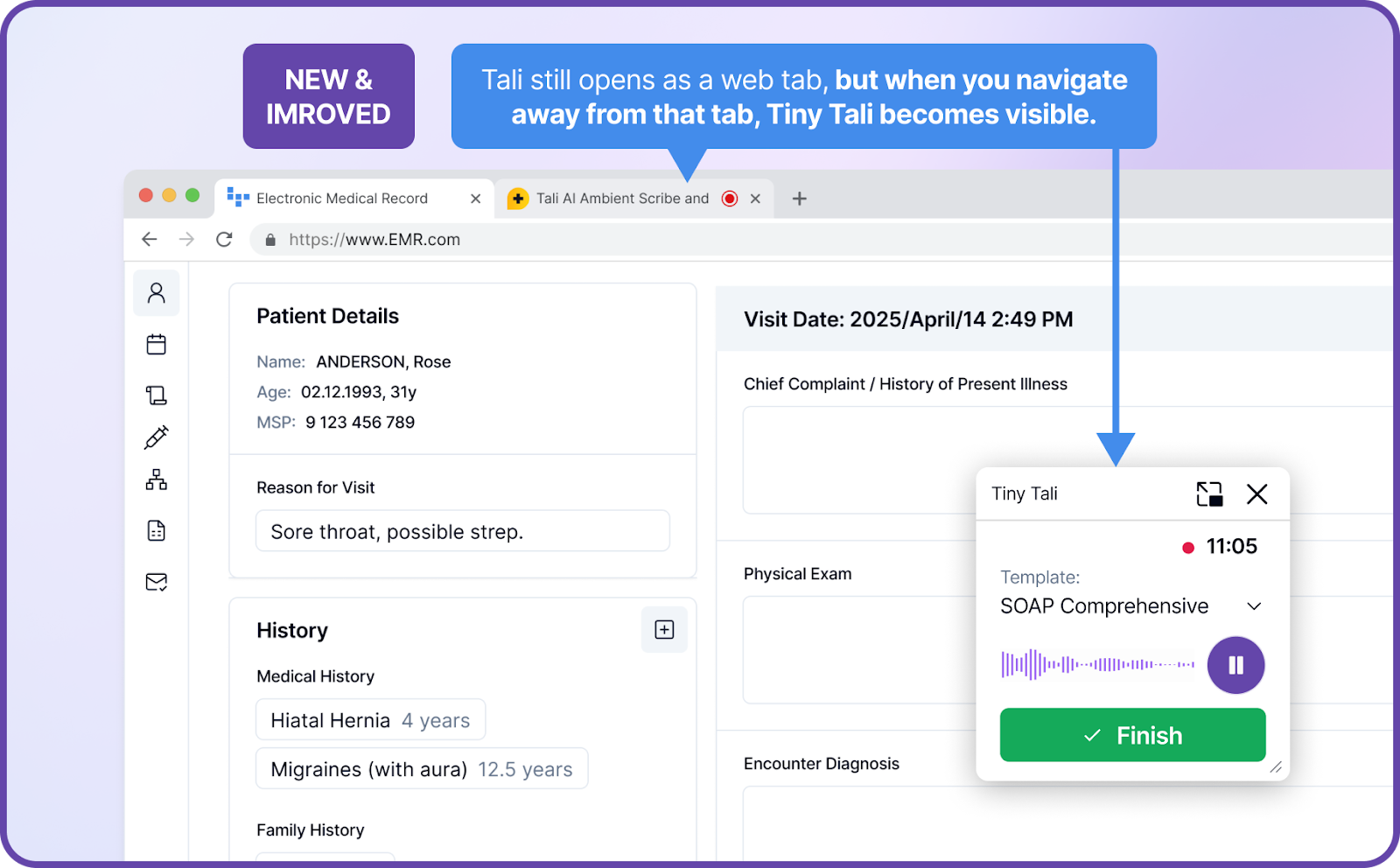 Launching Tali will STILL open a new tab/refresh the tab based on what EMR you are using. But now, when you start an encounter and navigate away from the Tali tab, a little picture-in-picture window appears: