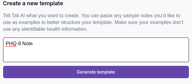 If you have personal templates that you use for a specific issue or population, you can now upload and create Tali AI notes with them. At the moment, this feature is currently only on the web app. Templates created in the web app can be used across other supported Tali AI platforms, provided both platforms are synced and associated with the same account. The Chrome Addon and desktop app allow you to utilize existing templates but lack template creation or modification features.