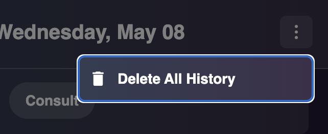 To delete all notes in your history, click the three vertical dots button in the top right corner of the History tab and click Delete All History