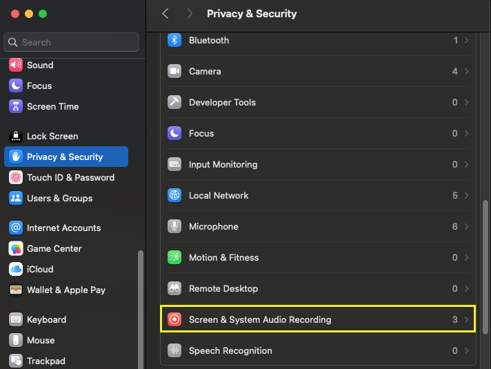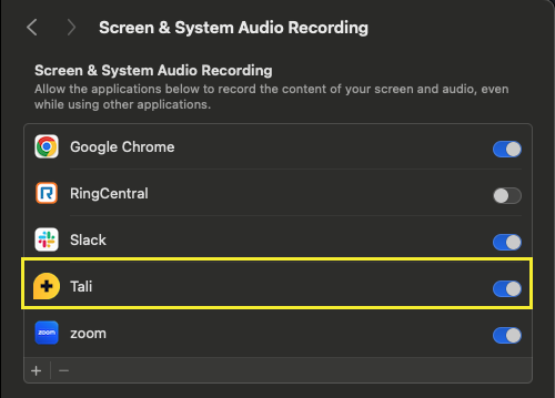 If you don’t see Tali listed yet, open Tali and start a recording — macOS should prompt you for permission.
