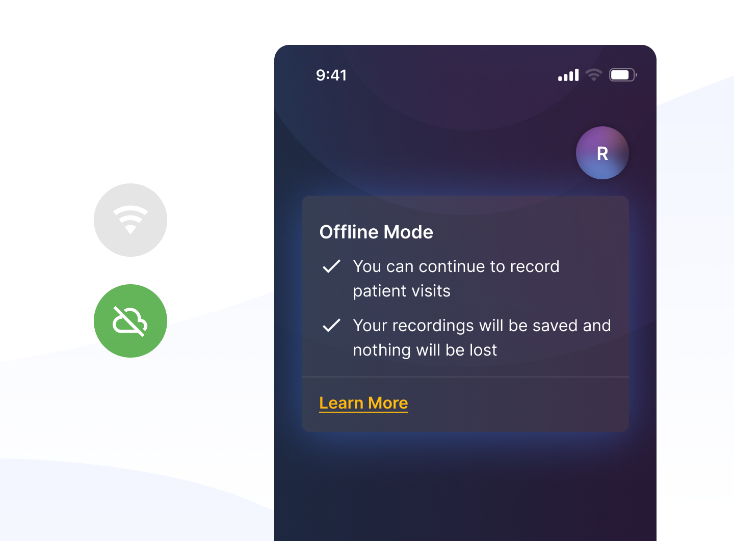 With Offline Mode, Tali will keep the record of your patient visit saved in the Tali app, securely and carefully encrypted, until you can reconnect and generate your notes. Offline Recording means that the audio recording of your visit is still available even if your device loses network connectivity. We know that bad wifi has been impacting Tali users in some clinics, leading to confusing or incomplete notes.
