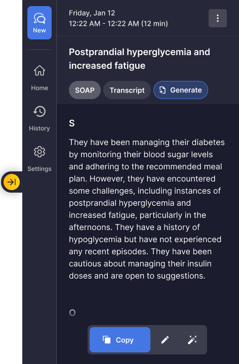 Go to a note that you want to edit (Your notes can be found in your History Tab, or following the creation of a note using the AI Scribe)