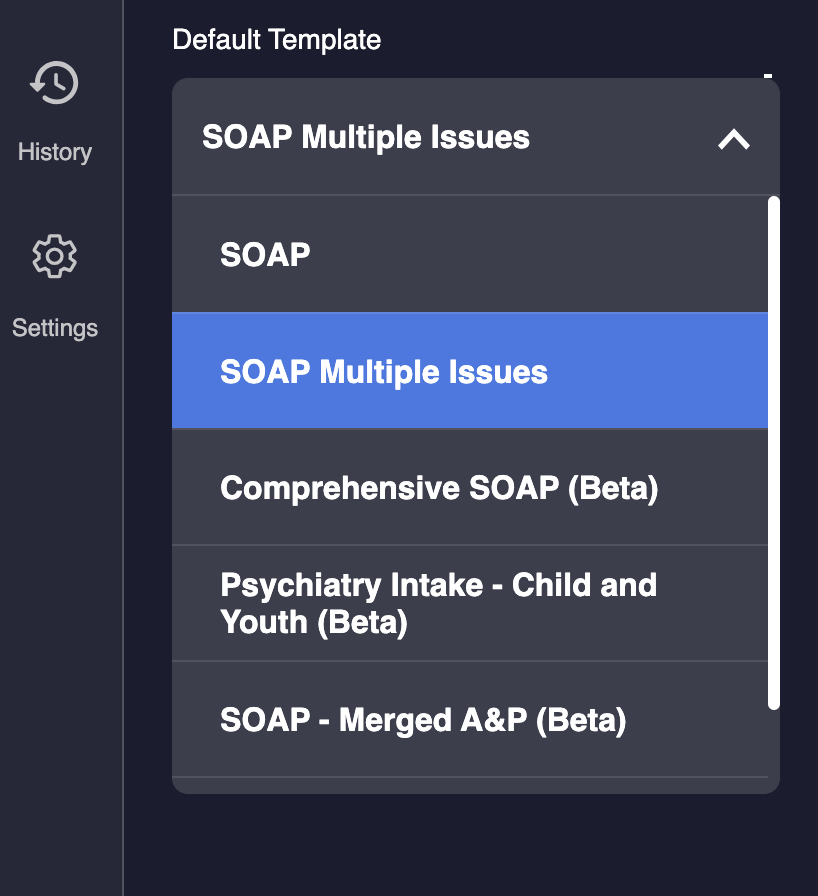 Find yourself frequently using something other than our SOAP template most of the time? Now, you can pick the template you use most often as your default, and it will always be used when recording AI Scribe sessions.